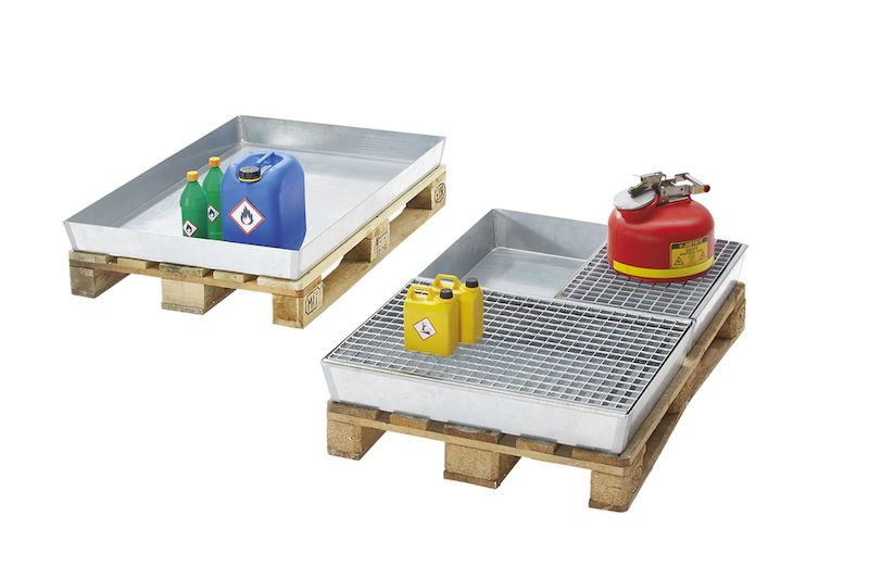 Uppsamlingskärl Evin, uppsamlingsvolym 40 l, lastkapacitet 100 kg, galvaniserad. Godkänt för brännbara vätskor i GHS-kategori 1–3 och vattenskadande vätskor i GHS-kategori 1–4. Av galvaniserad, helsvetsad 3 mm stålplåt.