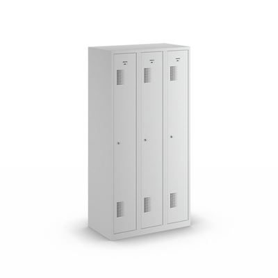 Klädskåp, Antibakteriellt Amsterdam, 3 sektioner, ljusgrå, bredd 900 mm. Klädskåpet Amsterdam övertygar genom sin svetsade, pulverlackerade stålkonstruktion (tjocklek stomme 0,6 mm, dörrar 0,7 mm) och sin antibakteriella beläggning som uppfyller högsta hygienkrav.