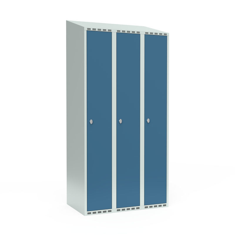 Klädskåp Fydor SMG, 900x 550x1900 mm, 3 dörrar i 3 skåp , sluttande tak, blå/ljusgrå. Med Fydor-serien får du ett klassiskt men modernt helsvetsat omklädningsskåp med hög kvalitet och säkerhet.