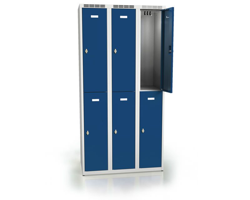 Klädskåp Hove, B 300/dörr, 6 dörrar i 3 skåp, grå/blå. Klädskåp för omgående leverans, färdiga att sättas på plats. Levereras monterat och med en 40 mm integrerad sockel. Skåp med hel dörr levereras med hatthylla, klädstång och krokar.