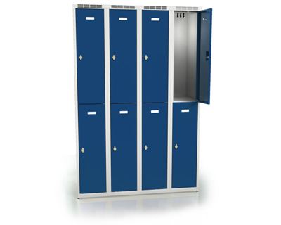 Klädskåp Hove, B 300/dörr, 8 dörrar i 4 skåp, grå/blå. Klädskåp för omgående leverans, färdiga att sättas på plats. Levereras monterat och med en 40 mm integrerad sockel. Skåp med hel dörr levereras med hatthylla, klädstång och krokar.