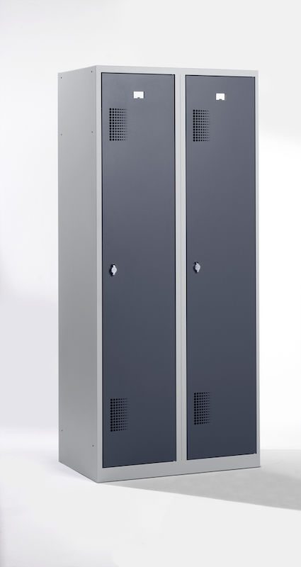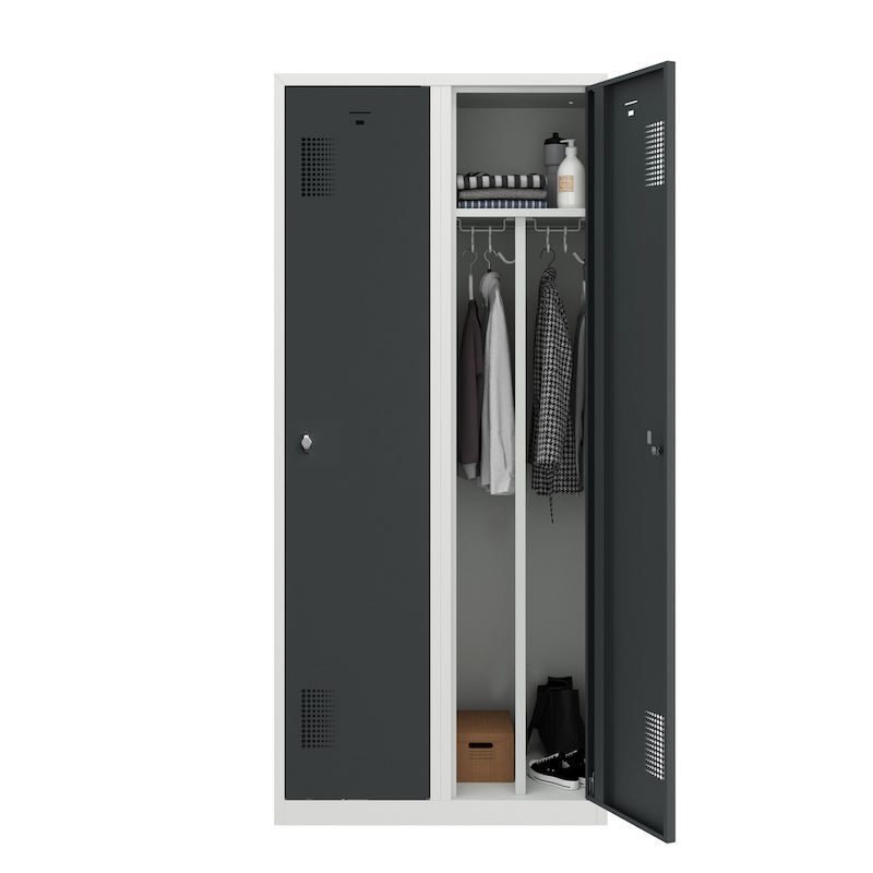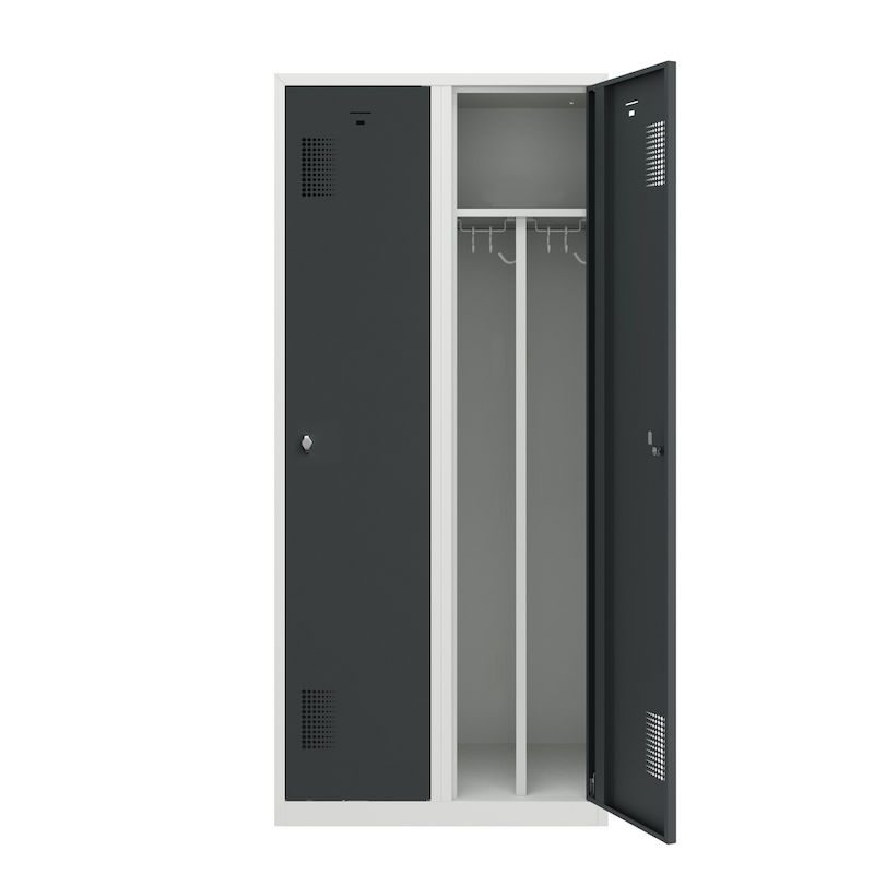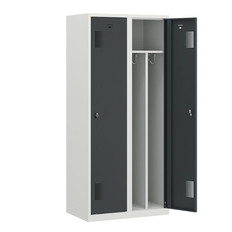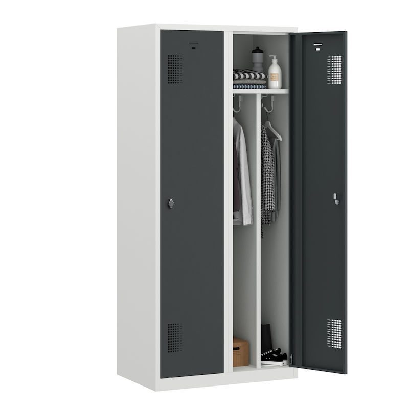 Klädskåp med mellanvägg Amsterdam, 2 sektioner, ljusgrå/basaltgrå, bredd 800 mm. Vårt stabila klädskåp med ljusgrå stomme övertygar när det gäller funktionalitet, stabilitet och pris-/prestandaförhållande. Den svetsade stålplåtskonstruktionen sörjer för användning med lång livslängd och uppfyller de höga kraven på klädskåp i yrkesvärlden. Den perforerade dörren säkerställer optimal luftcirkulation vid förvaring av arbetskläder.