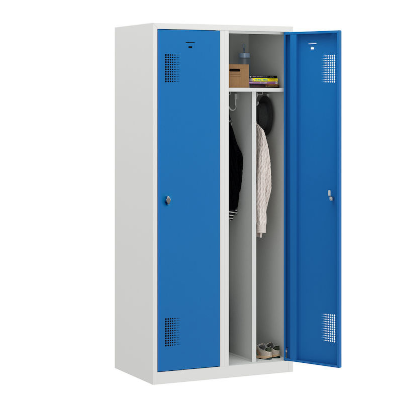 Klädskåp med mellanvägg Amsterdam, 2 sektioner, ljusgrå/ljusblå, bredd 800 mm. Vårt stabila klädskåp med ljusgrå stomme övertygar när det gäller funktionalitet, stabilitet och pris-/prestandaförhållande. Den svetsade stålplåtskonstruktionen sörjer för användning med lång livslängd och uppfyller de höga kraven på klädskåp i yrkesvärlden. Den perforerade dörren säkerställer optimal luftcirkulation vid förvaring av arbetskläder.