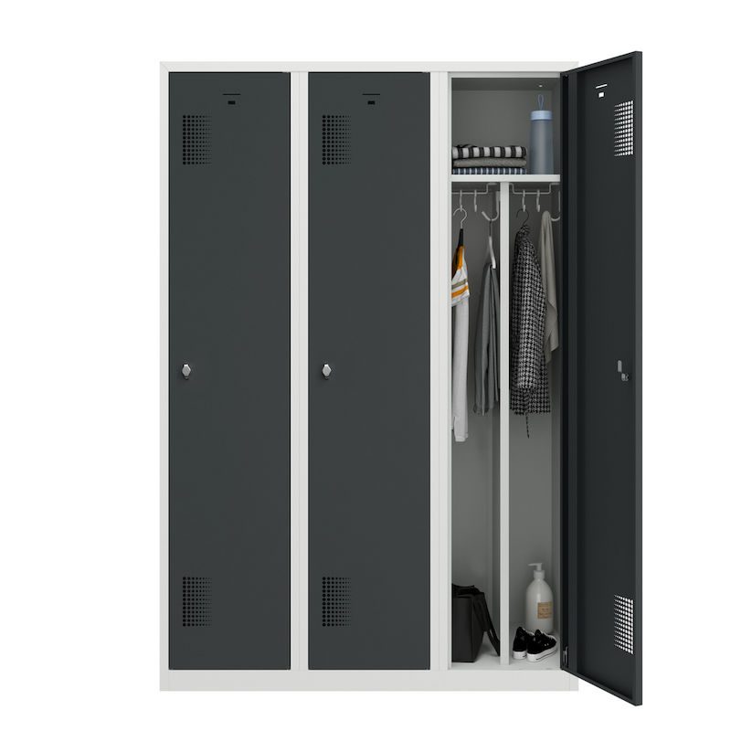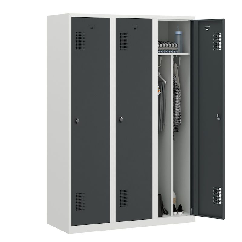 Klädskåp med mellanvägg Amsterdam, 3 sektioner, ljusgrå/basaltgrå, bredd 1200 mm. Vårt stabila klädskåp med ljusgrå stomme övertygar när det gäller funktionalitet, stabilitet och pris-/prestandaförhållande. Den svetsade stålplåtskonstruktionen sörjer för användning med lång livslängd och uppfyller de höga kraven på klädskåp i yrkesvärlden. Den perforerade dörren säkerställer optimal luftcirkulation vid förvaring av arbetskläder.