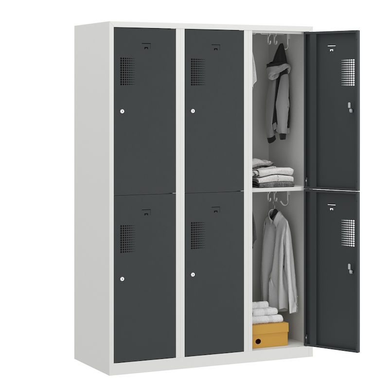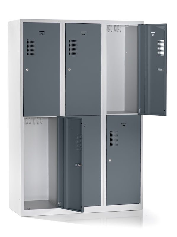 Fackskåpet övertygar genom sin robusta konstruktion av pulverlackerat stål, vilket gör det extra motståndskraftigt mot repor och korrosion. Placeringen av facken ovanpå varandra minskar platsbehovet och passar perfekt i verkstäder, idrottsanläggningar eller lager. Tack vare den integrerade perforeringen säkerställs optimal luftcirkulation.
