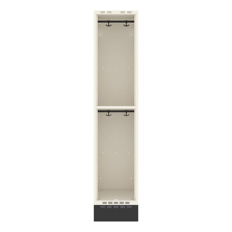Helskåp kommer med hatthylla och klädstång inklusive ankarkrokar, och 2-delat skåp med klädstång inklusive ankarkrokar som standard, skåp med tre, fyra och fem fack i höjd är utan inredning. 18 mm tjocka dörrar av specialprofilerad och pulverlackerad stålplåt, infällda i karmen med dolda gångjärn. Dörrstopp vid 90 grader samt invändig förstärkningsplåt runt låshålet. Slät skåpbotten utan trösklar som underlättar städning. Sockel som standard lackerad i svart färg.