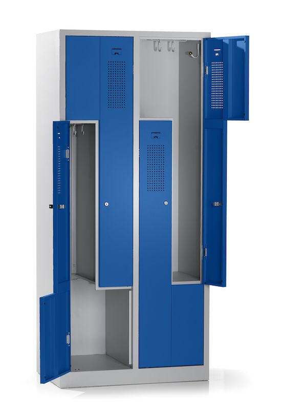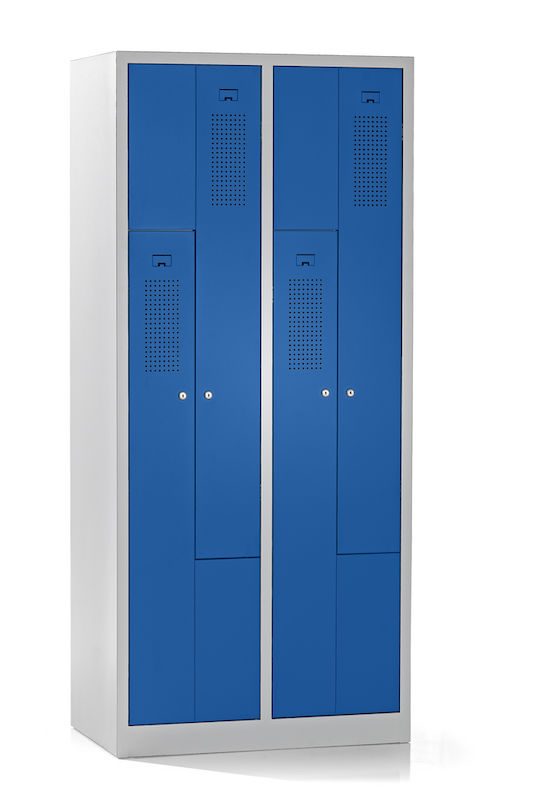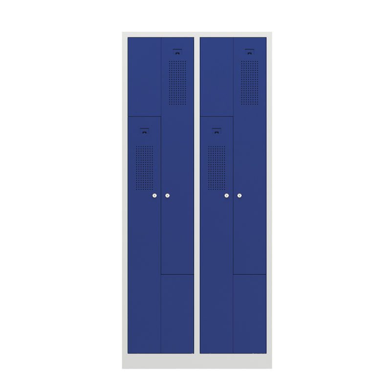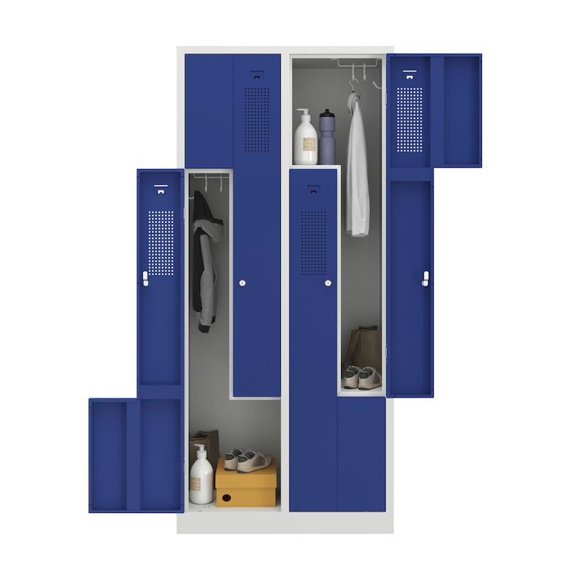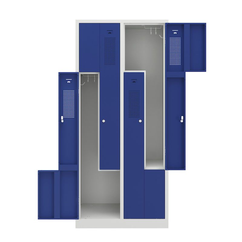 Ett z-skåp kombinerar platsbesparande design med genomtänkt funktionalitet. Det här stålklädskåpet passar perfekt i omklädningsrum på företag och fritidsinrättningar. Det har två skåpfack på samma yta som ett skåp. Den intelligenta z-formade facklayouten erbjuder effektiv klädförvaring utan att kompromissa med användbarheten.