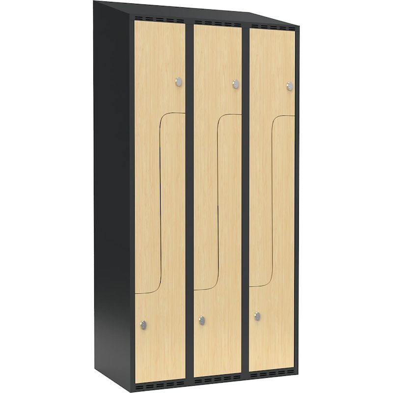 Z-skåp Fydor SMZ, 900x550x1900 mm, 6 dörrar i 3 skåp, sluttande tak, ant/björk. Med Fydor-serien får du ett klassiskt men modernt helsvetsat omklädningsskåp med hög kvalitet och säkerhet.