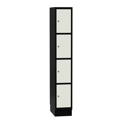Elevskåp Sonesson Flex, 4 dörrar i 1 skåp, BxDxH 300x550x1900 mm, vit/svart. Ett elevskåp som finns i flera olika färger och material att välja mellan. Tillverkad i plåt, lackerad som standard i varmvit eller svart färg. Fördelen med Flex-serien är att du kan till exempel ha ett helt klädskåp ihop med elevskåp och samtidigt behålla samma utseende på skåpen, då dom ingår i samma serie. Sockel som standard lackerad i svart färg. Levereras som standard med ASSA-lås 8450 och 2 nycklar. För annat låsalternativ än standard - kontakta kundtjänst för att beställa.