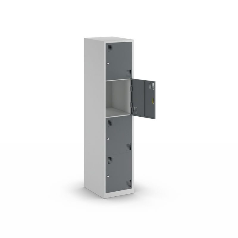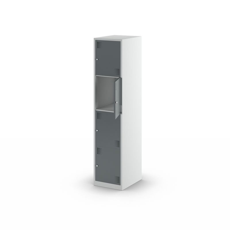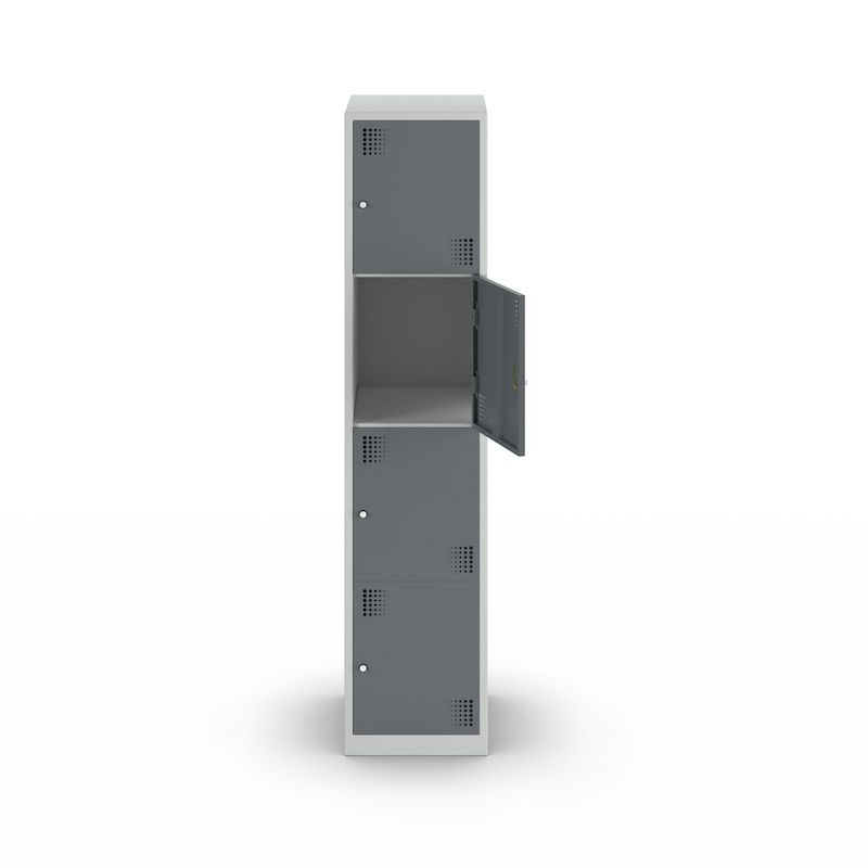 Småfacksskåpet har 4 rymliga fack ovanför varandra och erbjuder en genomtänkt förvaringslösning för olika föremål i omklädningsrum eller personalutrymmen i kontor, skolor, offentliga inrättningar eller i industri- och tillverkningsmiljöer.