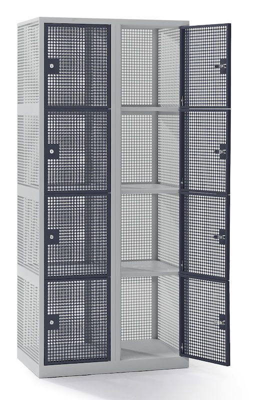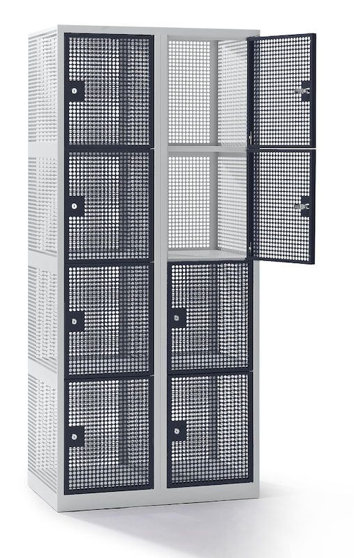 Småfacksskåp Klynne, BxDxH 800x500x1800 mm, klinka, 8 dörrar i 2 skåp, grå/basaltgrå. Ett klädskåp som du kan se in i med sin perforerade dörr, vilket ger optimal ventilation för arbetskläder, idrottskläder och idrottsutrustning. Levereras monterad med en 60 mm integrerad sockel. Finns i 2 olika fackbredder, 300 mm och 400 mm. Stommen är pulverlackerad i grå färg (RAL 7035) och dörrarna i blå (RAL 5012), grå (RAL 7035) eller basaltgrå (RAL7012) färg. Skåpet är låsbart med roterande säkerhetsklinka för hänglås eller cylinderlås med 2 nycklar. Huvudnyckel finns att köpa som tillbehör. Finns i flera olika storlekar.