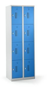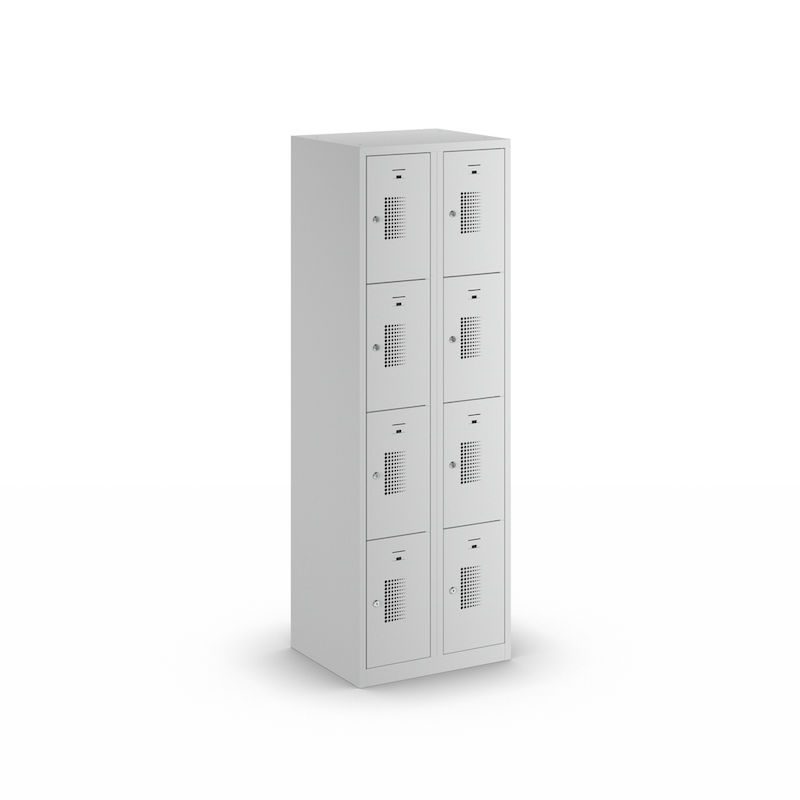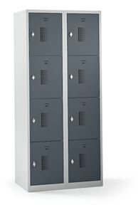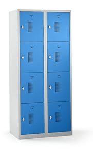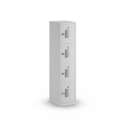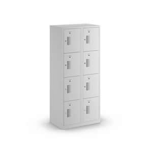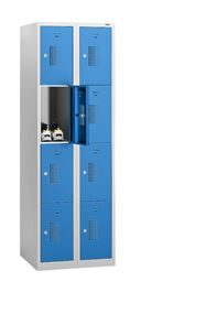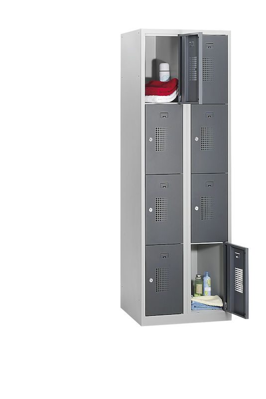 Småfacksskåp med 4 fack Amsterdam. Vårt prisvärda småfacksskåp övertygar när det gäller funktionalitet, lång livslängd och mångsidig användning. Skåpstommen är ljusgrå och lätt att rengöra. Pulverlackerat stål med 0,70 mm materialtjocklek säkerställer nödvändig säkerhet vid förvaring av personliga värdesaker. Variera antalet fack, låstyp, dörrfärg och klädskåpsbredd utifrån behov och platstillgång. Perforering i dörrarna säkerställer optimal luftcirkulation.