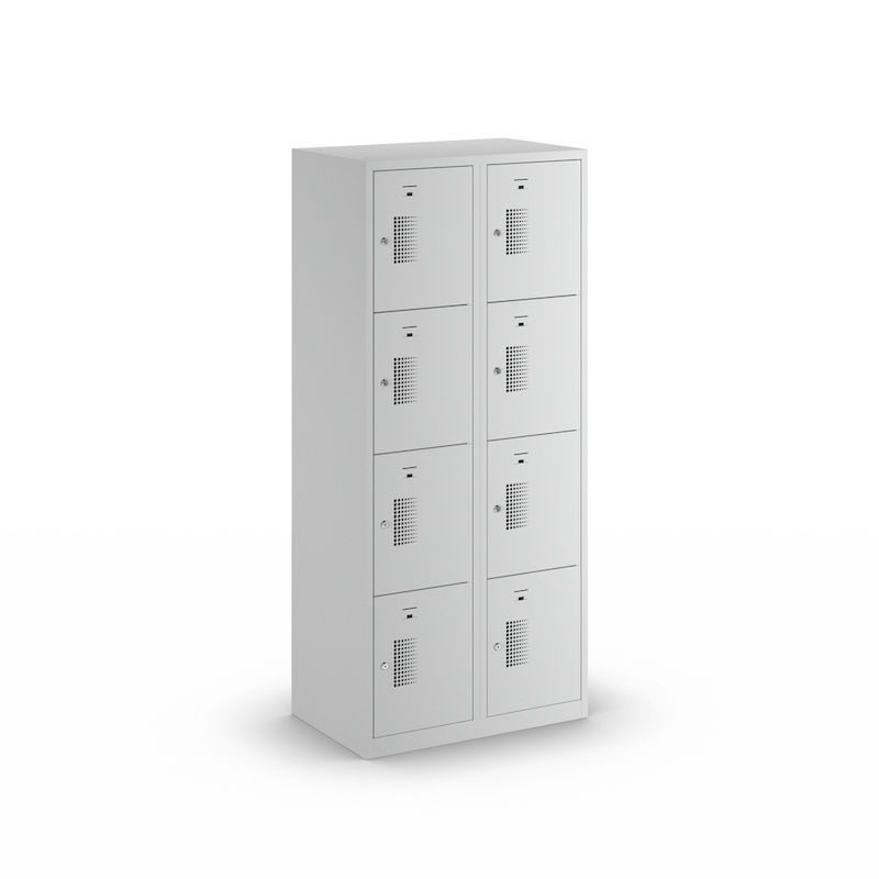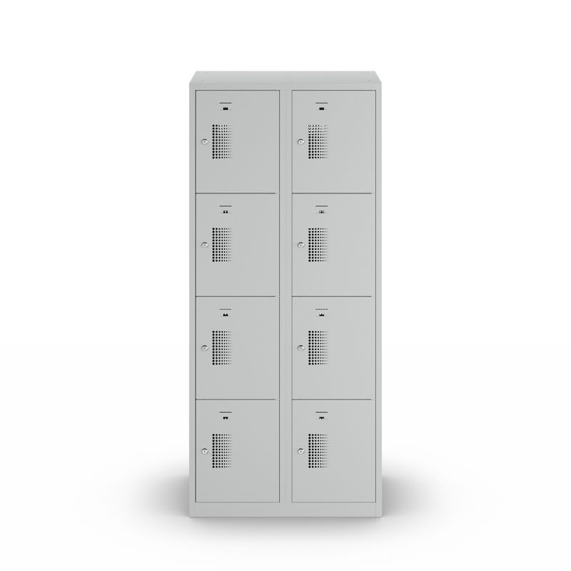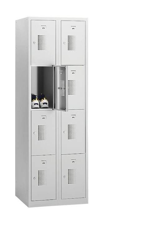 Småfacksskåp med 4 fack Amsterdam, 2 sektioner, ljusgrå, B 800 mm, 8 fack, cylinderlås. Vårt prisvärda småfacksskåp övertygar när det gäller funktionalitet, lång livslängd och mångsidig användning. Skåpstommen är ljusgrå och lätt att rengöra. Pulverlackerat stål med 0,70 mm materialtjocklek säkerställer nödvändig säkerhet vid förvaring av personliga värdesaker. Variera antalet fack, låstyp, dörrfärg och klädskåpsbredd utifrån behov och platstillgång. Perforering i dörrarna säkerställer optimal luftcirkulation.