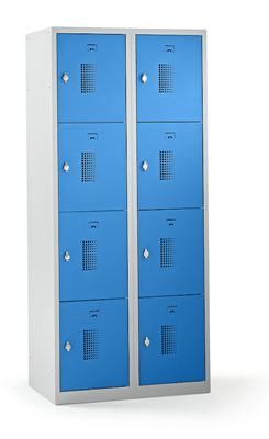 Småfacksskåp med 4 fack Amsterdam, 2 sektioner, ljusgrå/ljusblå, B 800 mm, 8 fack, vridregel. Vårt prisvärda småfacksskåp övertygar när det gäller funktionalitet, lång livslängd och mångsidig användning. Skåpstommen är ljusgrå och lätt att rengöra. Pulverlackerat stål med 0,70 mm materialtjocklek säkerställer nödvändig säkerhet vid förvaring av personliga värdesaker. Variera antalet fack, låstyp, dörrfärg och klädskåpsbredd utifrån behov och platstillgång. Perforering i dörrarna säkerställer optimal luftcirkulation.