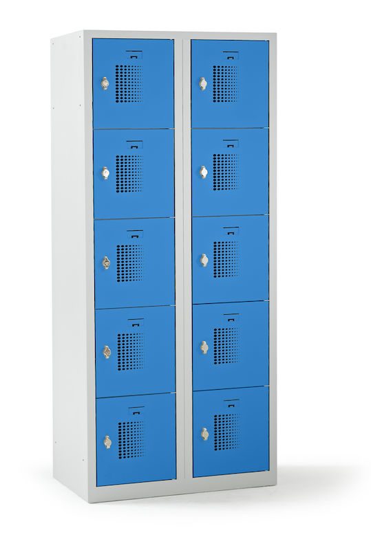 Småfacksskåp med 5 fack Amsterdam, 2 sektioner, ljusgrå/ljusblå, B 800 mm, 10 fack, vridregel. Vårt prisvärda småfacksskåp övertygar när det gäller funktionalitet, lång livslängd och mångsidig användning. Skåpstommen är ljusgrå och lätt att rengöra. Pulverlackerat stål med 0,70 mm materialtjocklek säkerställer nödvändig säkerhet vid förvaring av personliga värdesaker. Variera antalet fack, låstyp, dörrfärg och klädskåpsbredd utifrån behov och platstillgång. Perforering i dörrarna säkerställer optimal luftcirkulation. På varje dörr finns det dessutom en etiketthållare med måtten 30 x 50 mm för enkel namnanpassning.