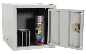 Skåpet har infällda, dolda gångjärn och espanjolettlås med tre låspunkter för säker förvaring. Pulverlackerad i grått, RAL 7035.