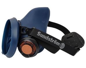Halvmask Sundström SR100. Två utandningsventiler som ger ett mycket lågt utandningsmotstånd. Ventillocken med avskärmare skyddar effektivt utandningsmembranen mot damm och färgstoft. Enkelt justerbart resårbandställ är utformat som en v-slinga och har en stor skålad hjässplatta. Detta ger masken en god tätning mot ansiktet. Lågt placerat filterfäste ger bra sikt. Masken används som filterskydd i kombination med filter ur Sundströms filtersortiment.