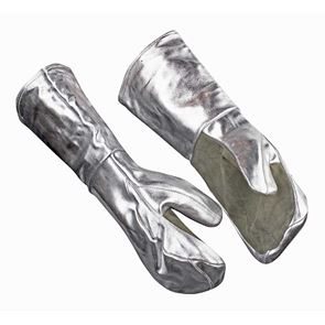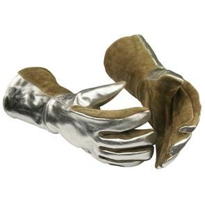 Denna arbetshandske är tillverkad i ett specialbehandlat spaltläder för ökad värmetålighet och har dubbla lager foder för ett maximerat värmeskydd. Lädret är aluminiserat på ovanhanden och ovansidan av kragen vilket gör att det reflekterar och avleder strålningsvärme. Handsken är förböjd för bättre passform och bekvämare användning och alla sömmar är sydda med värmetålig kevlartråd. Handsken finns i två utföranden: en 5-fingersmodell och en tumodell. Lämplig vid arbete i miljöer med starka värmekällor och vid kontakt med heta föremål