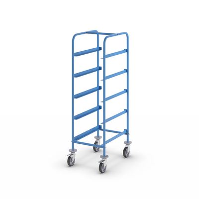 Backställ Loana, LxBxH 700 x 535 x 1573 mm, lastkapacitet 150 kg. Pulverlackerad stålkonstruktion, standardutförande i ljusblått RAL 5012. Perfekt för transport och plockning.