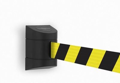 Tensabarrier industri, väggmodell 7,7 m, band: gul/svart, hus: svart. Robusta och rejäla avspärrningsband i toppkvalité som passar i tuffa miljöer. Väggmodeller med gul/svarta rullband och svart huskropp.