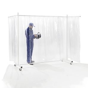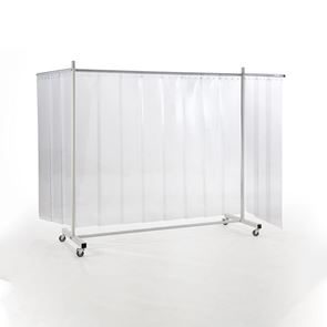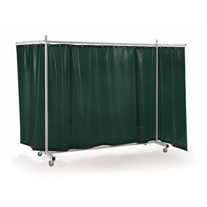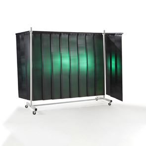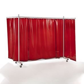 Svetsskärm Premium 3-delad. Användbar som skydd för gnistor och svetsloppor eller som rumsavdelare. Komplett byggsats med svetsskyddsfolie (tjocklek 0, 4 mm) eller med lamellgardiner (lameller 300x2 mm). 4 länkhjul varav 2 med broms. Golvhöjd med lameller 600 mm och folie 300 mm. Mörkgrön och röd ger bra skydd mot starkt sken, glasklar enbart som stänkskydd. Levereras omonterad, lätt att montera. HxB 1900x3800 mm, mittdel 2100 mm och 2 utvikbara armar 850 mm vardera.