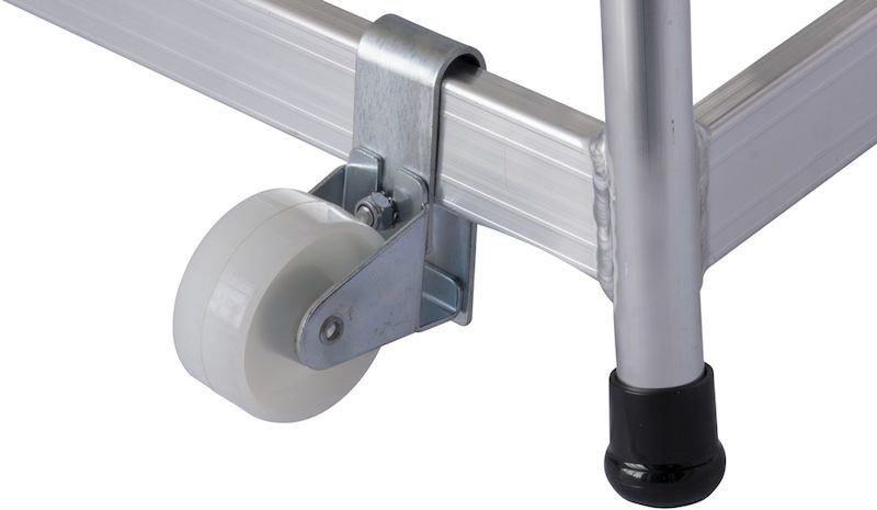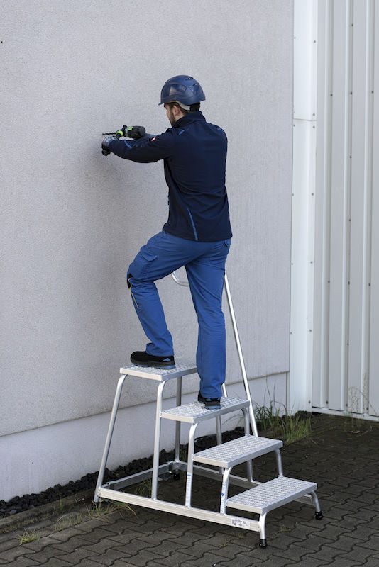 Ett stabilt räcke och specialformade stegkanter bidrar till säker uppstigning och nedstigning. Två integrerade hjul och en praktisk bygel gör det enkelt att flytta plattformstrappan. Trappsteget är dessutom utrustat med en wosatec QR-kodsetikett för digital dokumentation av inspektioner.