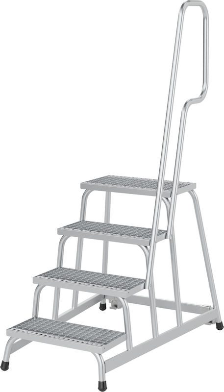 Arbetstrappa med räcke Ella, med gallertrappsteg, på en sida, 4 steg. Säker och mobil lösning för industriell användning: STABILO:s mobila arbetstrappsteg har en robust aluminiumkonstruktion och erbjuder hög stabilitet tack vare tandade gallersteg (halkskyddsklass R13 enligt DGUV regel 108-003 och DIN 51130).