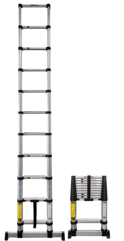 Teleskopstege Pro 11-steg. En kraftig teleskopstege tillverkad i anodiserad aluminium. Teleskopstegen justeras enkelt till rätt längd med hjälp av en kraftig låsmekanism som låser stegen steg för steg. Låsmekanismen indikerar även när steget låst fast ordentligt med hjälp av en grön markering. Teleskopstegen står stadigt på kraftiga golvskydd.