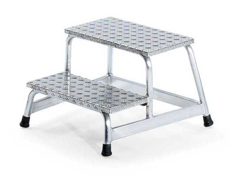 Arbetstrappa, stegyta 550x300 mm, 2 steg med plattform, BxD 710x610 mm. Med räfflade aluminiumsteg för säkert grepp för fötterna. Särskilt stabil och stadig i en svetsad rörkonstruktion av aluminium. Steg av halksäker, räfflad plåt, 225 mm djupa, övre stegyta 550 x 300 mm. Glidsäkra fötter av plast. Utmärkt att ha där man inte flyttar runt på trappan så ofta men kan behöva ett extra steg eller två. Finns i flera olika storlekar.