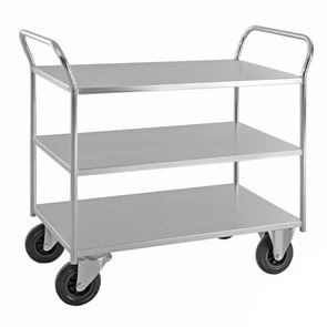Bordsvagn Bertha. Ett elförzinkat helsvetsat rullbord med två eller tre hyllplan. Finns med eller utan kant på hyllplanen.