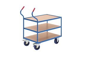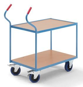 Bordsvagn Julius. Optimal kraftöverföring och smidighet. Den övre nivån har en 15 mm uppvikt stålkant som förhindrar att föremål rullar av. Lastytorna består av skivor med bokdekor.