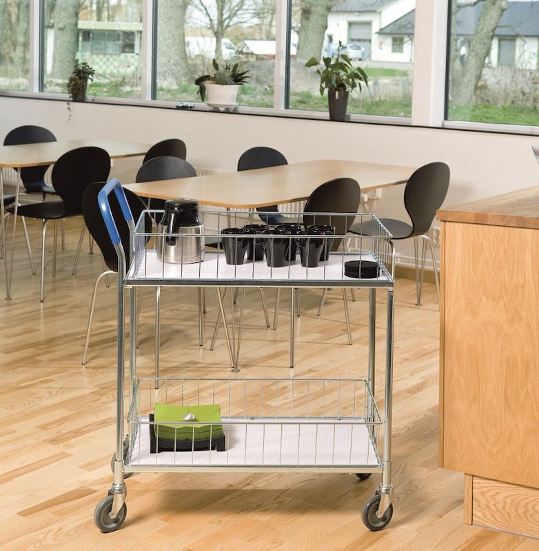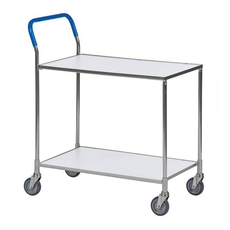 Bordsytan på 760x430 mm har laminatskivor som gör det lätt att hålla rent. Vagnen har smidiga hjul, med länkhjul som gör att du enkelt kan styra den, även i trånga utrymmen. Rörramen är förzinkad och har ett plastklätt bygelhandtag.