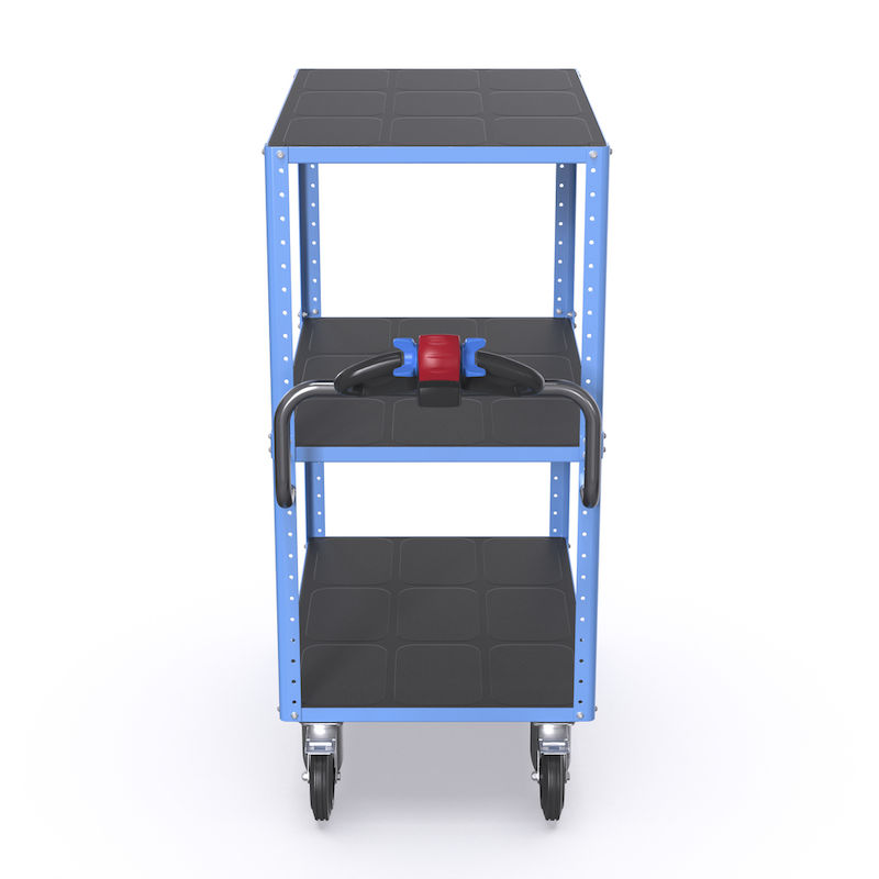 Tack vare den smarta modulkonstruktionen kan den eldrivna hyllvagnen alltid anpassas flexibelt efter dina individuella behov i arbetsvardagen. Välj bland våra standard modeller med två eller tre våningar.* Antal våningar kan utökas. Hyllplan i halkfri plast håller komponenter säkert på plats. För ännu mer flexibilitet kan hyllvagnen enkelt omvandlas till rullvagn. Tack vare modulkonstruktionen kan vagnen enkelt anpassas. Med hjälp av hålprofilen kan hyllplan placeras på olika höjder för att perfekt matcha din last. Du kan justera höjden på vagnen genom att kombinera olika långa hörnstolpar. Fler hyllplan och hörnstolpar finns separat som tillbehör. Den moderna designen i ljusblått och antracit är elegant och ger ytterligare möjligheter till personlig anpassning.