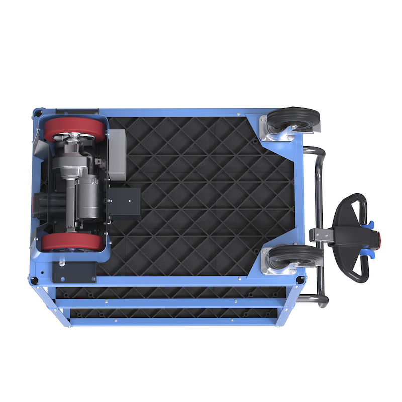 Elmodulen möjliggör enkel navigering och bekvämt handhavande med ett ergonomiskt utformat, multifunktionellt dragstångshandtag. Den är lättstyrd med stabila rörbyglar och erbjuder steglös hastighetsstyrning via två tumknappar (maxhastigheten är 4 km/h). Krypgång kan aktiveras vid behov för precisionskörning framåt och bakåt. Ytterligare säkerhetsfunktioner inkluderar en varningsfunktion i form av en tuta på handtaget och en skyddsbrytare som förhindrar fastklämning när vagnen backas. Det integrerade fotskyddet säkerställer att ingen kläms under vagnen. Elmodulen kräver inget förarbevis och har ett stöldskydd med låsfunktion för att begränsa åtkomst till batteriet.