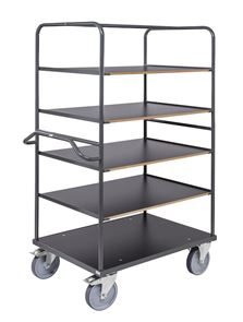 Hyllvagn Nean. En stabil hyllvagn som kommer med 5 laminathyllor i en grå pulverlackad stålkonstruktion. Vagnen rullar lätt och enkelt med termogummihjul. 2 fasta hjul och 2 länkhjul med broms, diameter 200 mm.