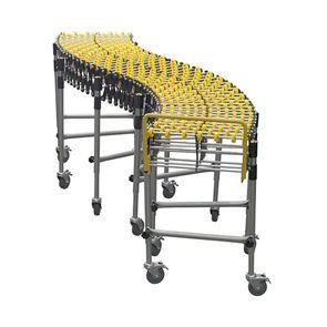 Saxbana Setten. Flexibel rullbana för hantering av lättare gods med slät botten så som lådor, backar och paket. Saxbanan är enkel att anpassa efter olika behov. Rullbanan kan formas efter eget önskemål i bland annat S-kurvor, runt stolpar eller hinder. Saxbanan kommer med rullbädd av nylonhjul ø 50 mm, 6 st på varje axel. Saxbanans underrede är tillverkat av stål. Vartannat benstöd levereras med bromsade hjul. Fullt utdragen har saxbanan ett c/c mått mellan hjulaxlarna på 125 mm och hopdragen 35 mm. Rullbäddens höjd kan enkelt justeras mellan 800-1000 mm.
