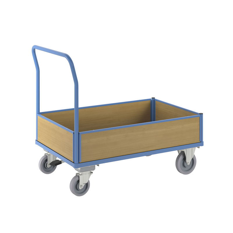 BeskrivningPlattformsvagn Line, med 4 halvhöga väggar, centralbroms, LxB 1300 x 800 mm, elastiska hjul