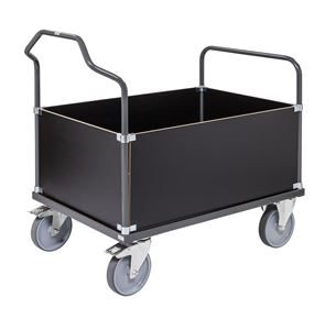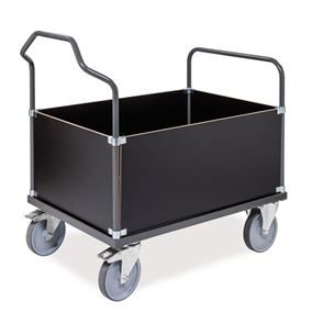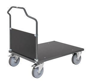Plattformsvagn Nean. En ergonomisk plattformsvagn med kraftig stålram pulverlackerad i grå färg och bruna laminatskivor. Lastkapacitet 500 kg. 2 fasta och 2 bromsade länkhjul, hjuldiameter 200 mm. Avstånd till lastplan 240 mm. Finns i två olika storlekar och två olika utföranden per storlek.