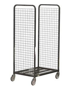 Elförzinkade vagnar med nätgavlar, 50x50 mm maskor, och kraftiga rörkonstruktioner.