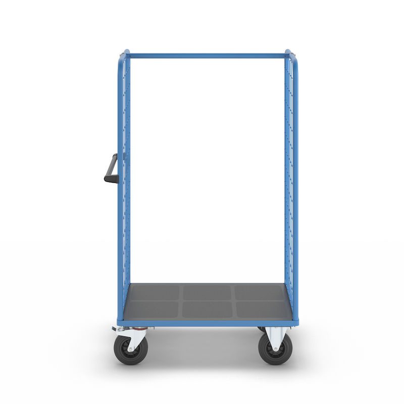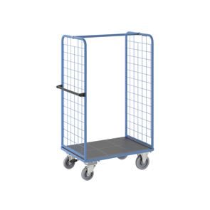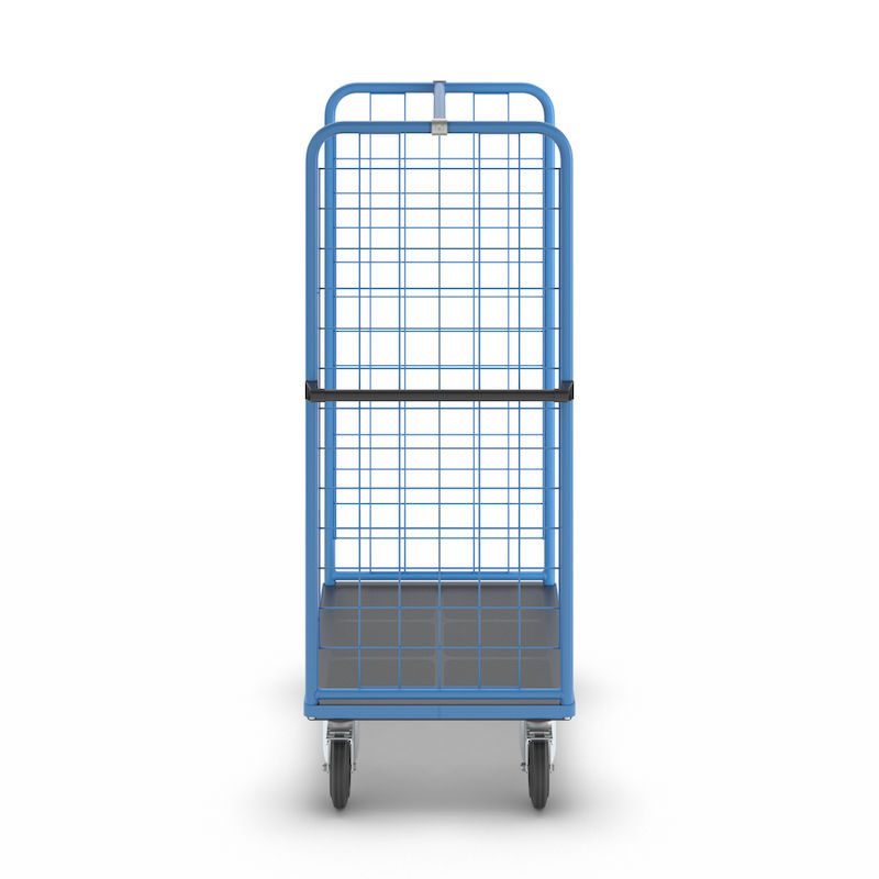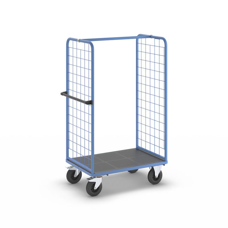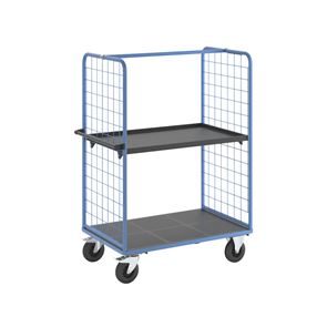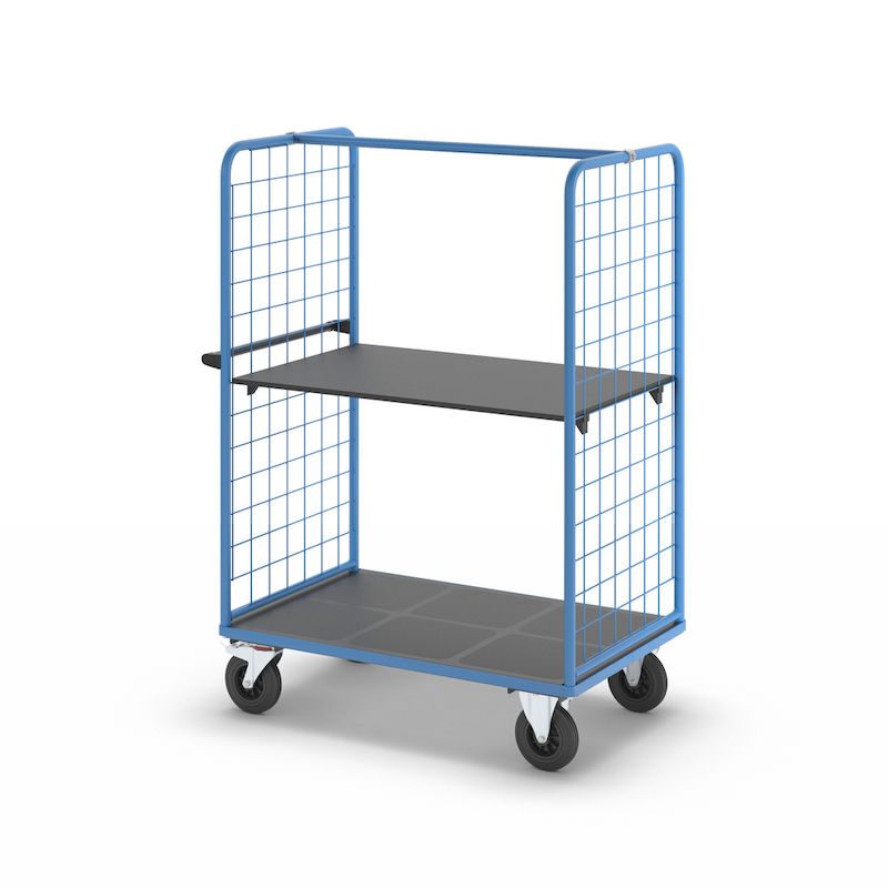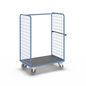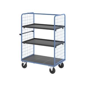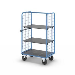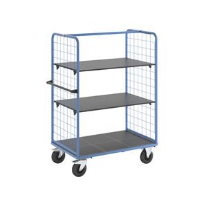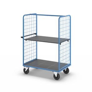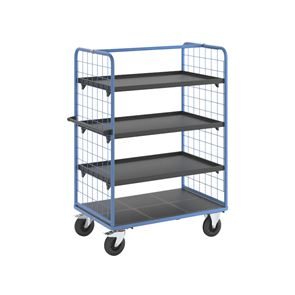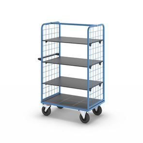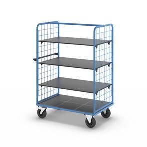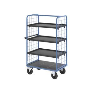 Plockvagn med gallersidor Bodil. Hyllvagnen med gallersidor ger en trygg och effektiv varuhantering. De två gallersidorna håller lasten säkert på plats och skyddar godset under transporten. Tack vare de integrerade bromsarna står vagnen stabilt när det behövs, vilket gör den idealisk för plockarbete. Det ergonomiska skjuthandtaget i kombination med lättmanövrerade svänghjul ger smidig och flexibel förflyttning till användningsplatsen. Den slitstarka lastytan av återvunnet plastmaterial kombinerar hållbarhet med lång livslängd. Oavsett om det gäller lager, produktion eller leveranser är denna mångsidiga vagn ett pålitligt hjälpmedel för säker och effektiv godshantering.