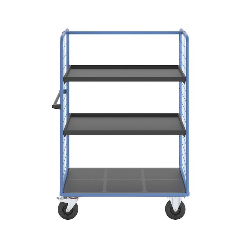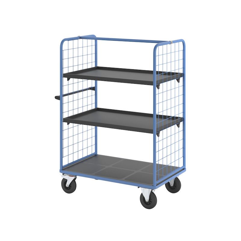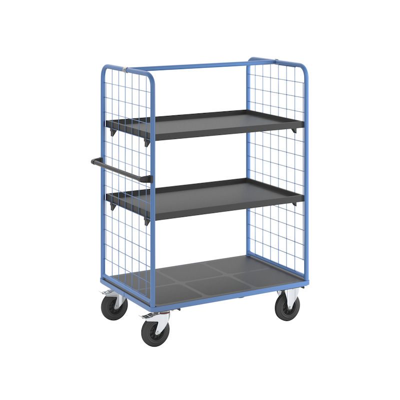BeskrivningPlockvagn med gallersidor Bodil, massivgummihjul, lastyta LxB 1175 x 800 mm, 3 hyllplan, med kant
