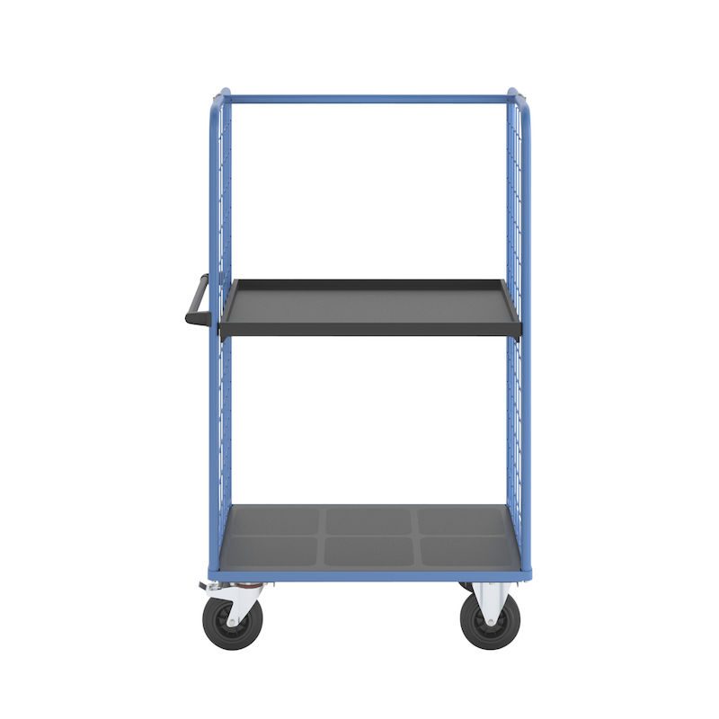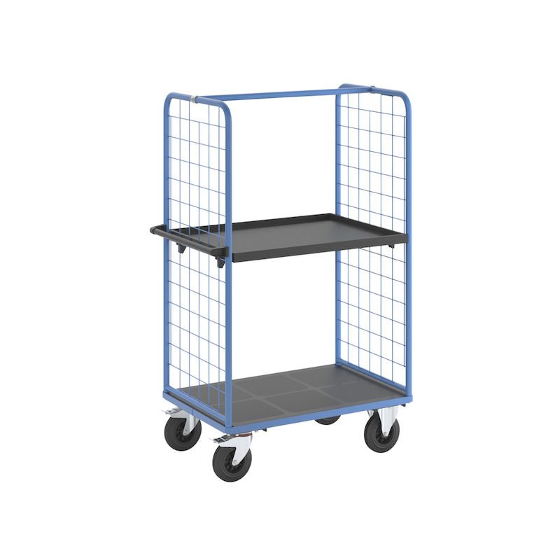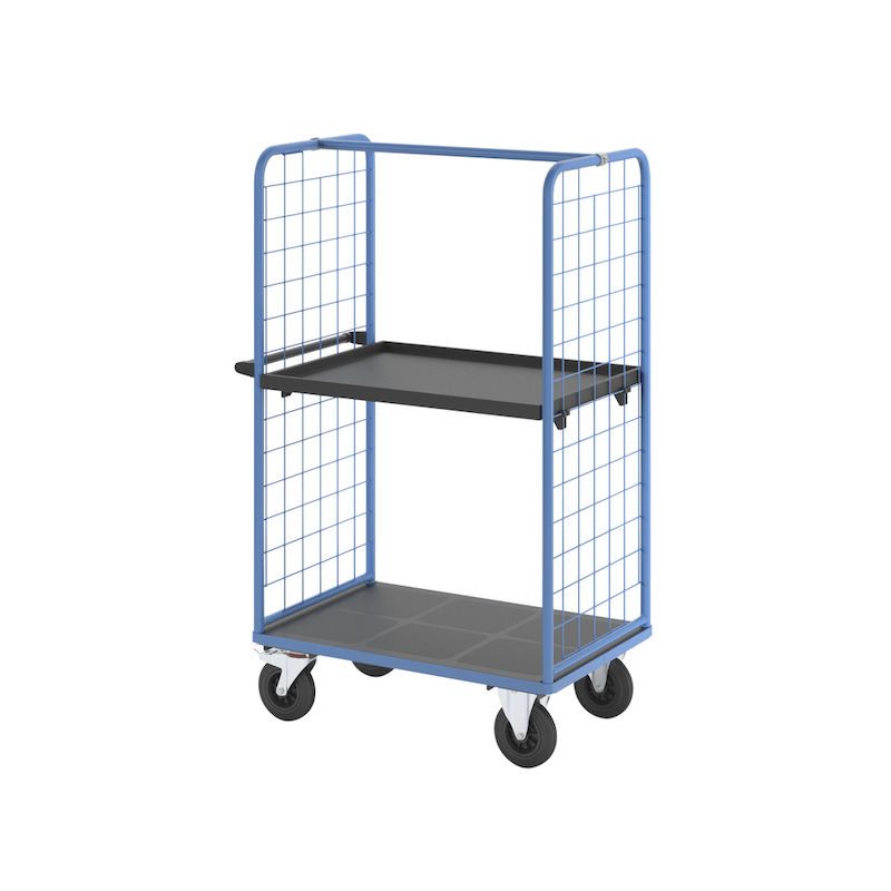 BeskrivningPlockvagn med gallersidor Bodil, massivgummihjul, lastyta LxB 975 x 700 mm, 2 hyllplan, med kant