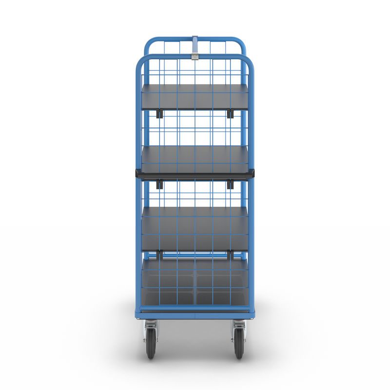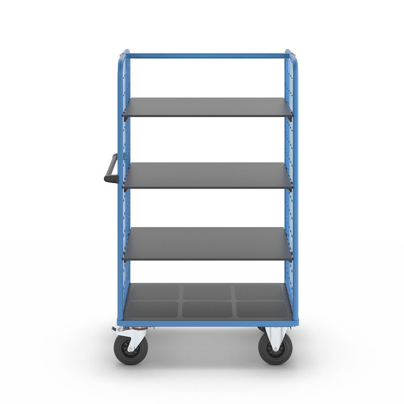 Plockvagn med gallersidor Bodil, massivgummihjul, lastyta LxB 975 x 700 mm, 4 hyllplan. Hyllvagnen med gallersidor ger en trygg och effektiv varuhantering. De två gallersidorna håller lasten säkert på plats och skyddar godset under transporten. Tack vare de integrerade bromsarna står vagnen stabilt när det behövs, vilket gör den idealisk för plockarbete. Det ergonomiska skjuthandtaget i kombination med lättmanövrerade svänghjul ger smidig och flexibel förflyttning till användningsplatsen. Den slitstarka lastytan av återvunnet plastmaterial kombinerar hållbarhet med lång livslängd. Oavsett om det gäller lager, produktion eller leveranser är denna mångsidiga vagn ett pålitligt hjälpmedel för säker och effektiv godshantering.
