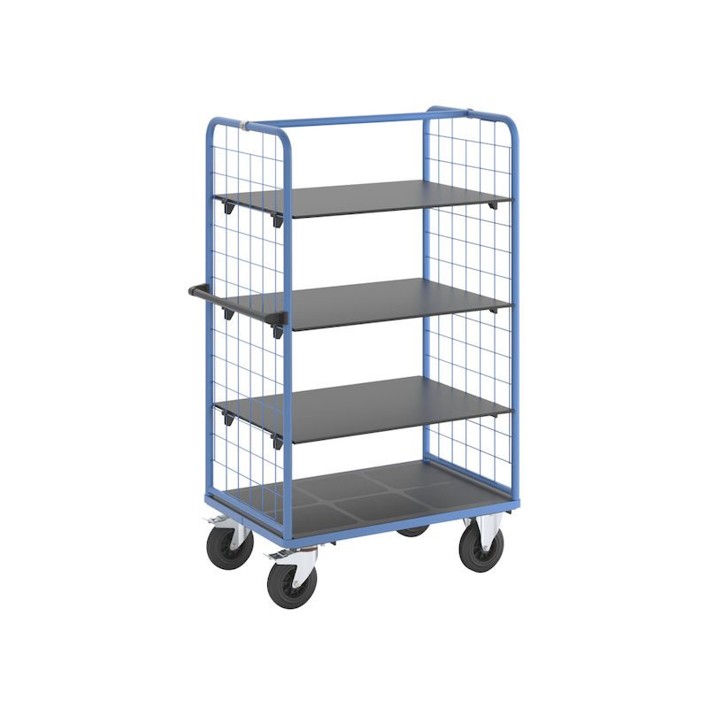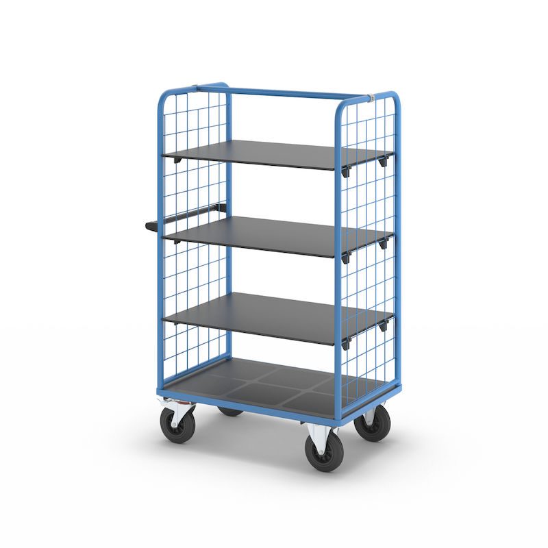 BeskrivningPlockvagn med gallersidor Bodil, massivgummihjul, lastyta LxB 975 x 700 mm, 4 hyllplan