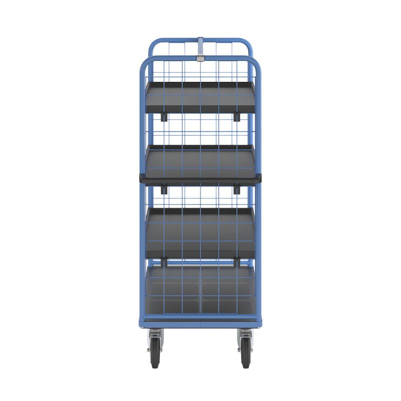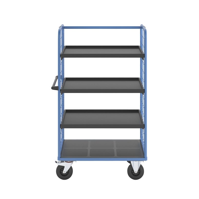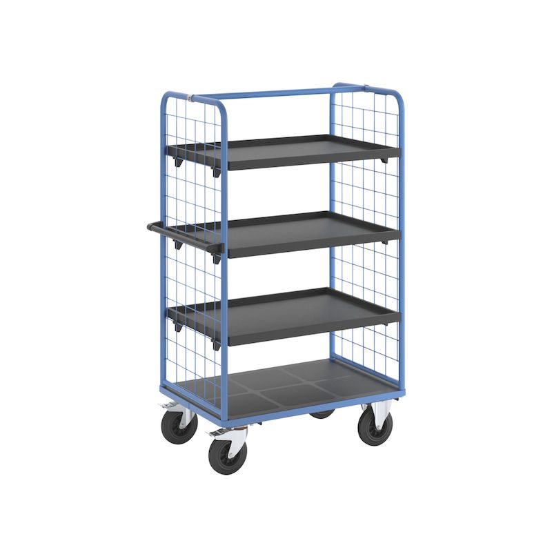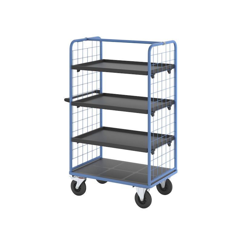 BeskrivningPlockvagn med gallersidor Bodil, massivgummihjul, lastyta LxB 975 x 700 mm, 4 hyllplan, med kant