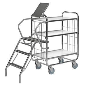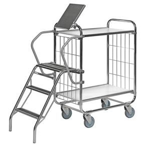 Plockvagn Ven, med stege, som har en automatiskt återgående stege. Plockvagnen är elförzinkad med laminatskivor.
