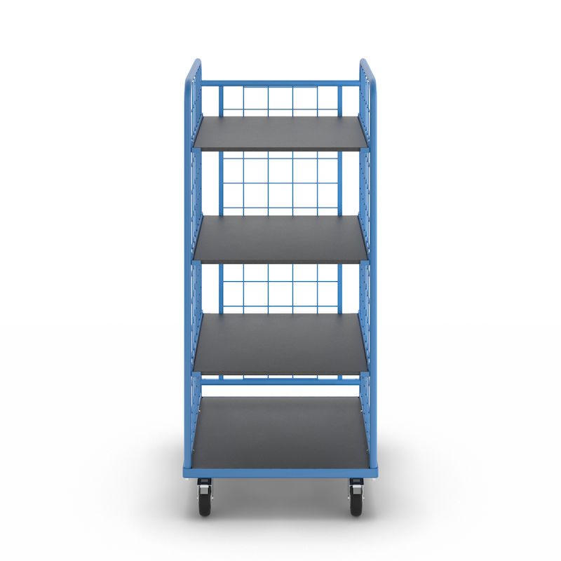 Postbur Olaus, gallerklädd på 3 sidor, lastyta 750 x 650 mm, med 3 hyllplan. Pulverlackerad, standardutförande i ljusblått RAL 5012. Skruvas fast i botten av dekorbelagd MDF-skiva.
