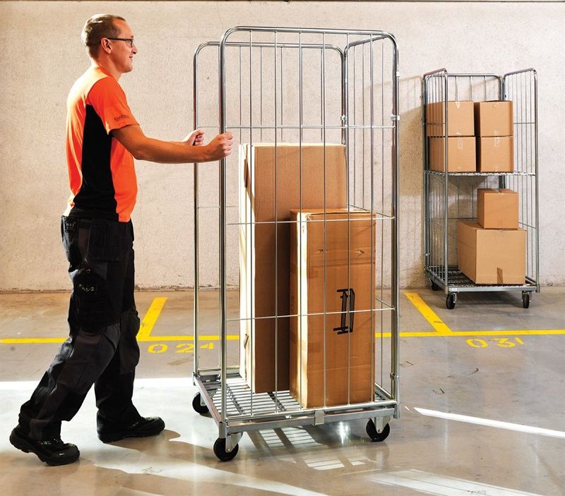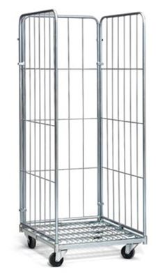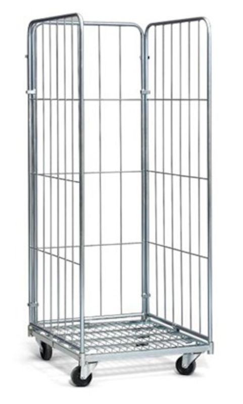 Rullcontainer, HxLxB 1800x720x800 mm, med 3 väggar, max 400 kg. Lastkapacitet 400 kg. Elförzinkad rullcontainer som finns med 2 eller 3 väggar samt halvhängd grind.