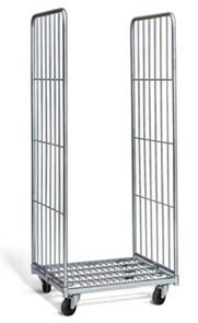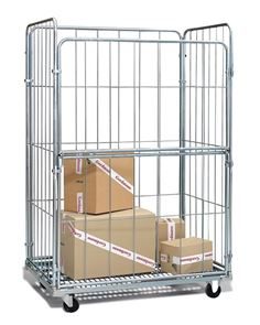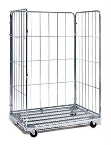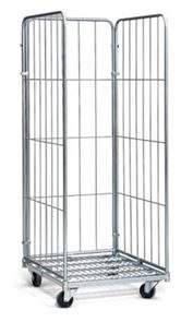 Rullcontainer med 2 till 3 väggar. Lastkapacitet 400 kg. Elförzinkad rullcontainer som finns med 2 eller 3 väggar samt halvhängd grind.
