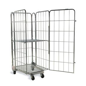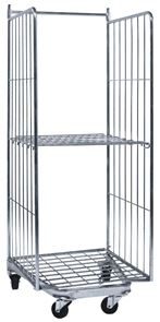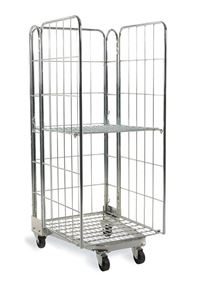 Stackningsbar Rullcontainer. En rullcontainer med 3 eller 4 väggar som är stackningsbar, vilket sparar på utrymme, då bottnen går att fälla upp.